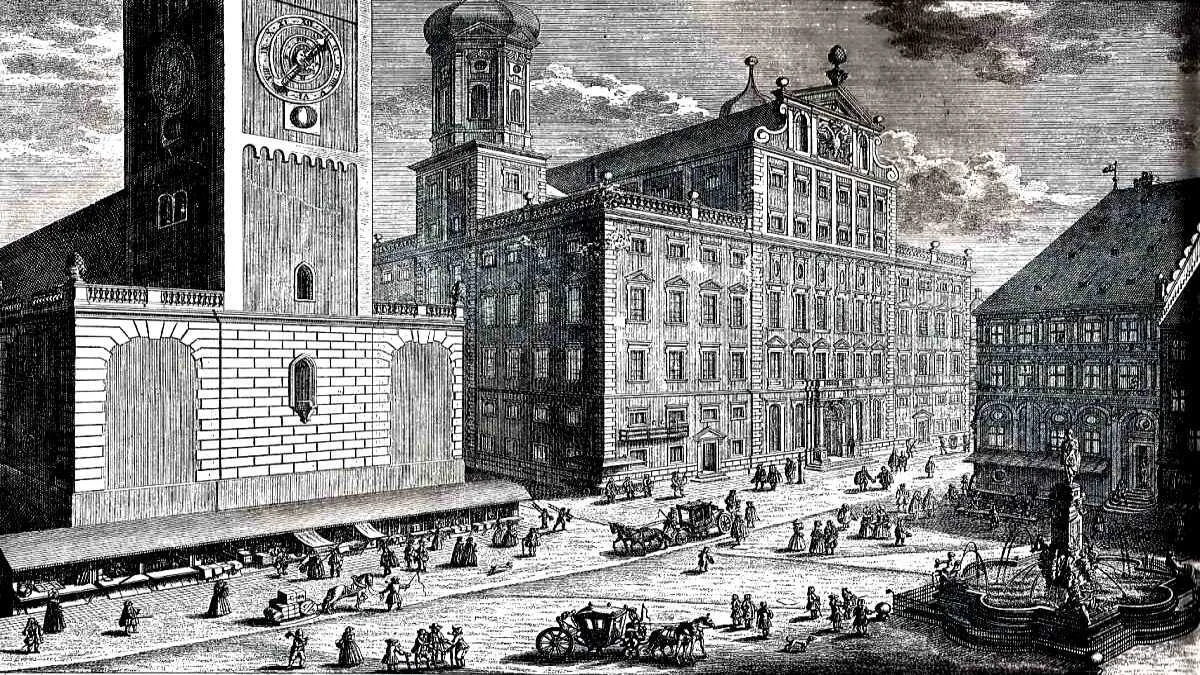 Der Blick auf den Ludwigsplatz mit Rathaus und Perlach, nach einem Kupferstich von J. Wolff, zeigt den zentralen Abschnitt dieser Straße, die für die Geschichte Augsburgs so bedeutend ist. Im Mittelalter waren die Wirren des Investiturstreites zur Erweiterung seiner Selbstverwaltung genutzt worden.